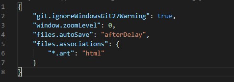 在主命令框中输入Settings,找到Preferences: Open Settings (Json),进入设置文件,在files.associations中新增*.art行。