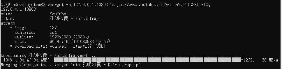 you-get -x 192.168.0.13:1080 https://www.youtube.com/watch?v=lIES3ii-IOg you-get -s 192.168.0.13:1081 https://www.youtube.com/watch?v=lIES3ii-IOg