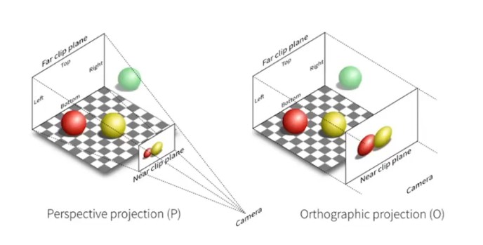摄像机的可视角度(FOV——field-of-view)以及宽高比(aspect ratio)决定了这个锥体的角度,以及最终投影到屏幕上的宽高比。