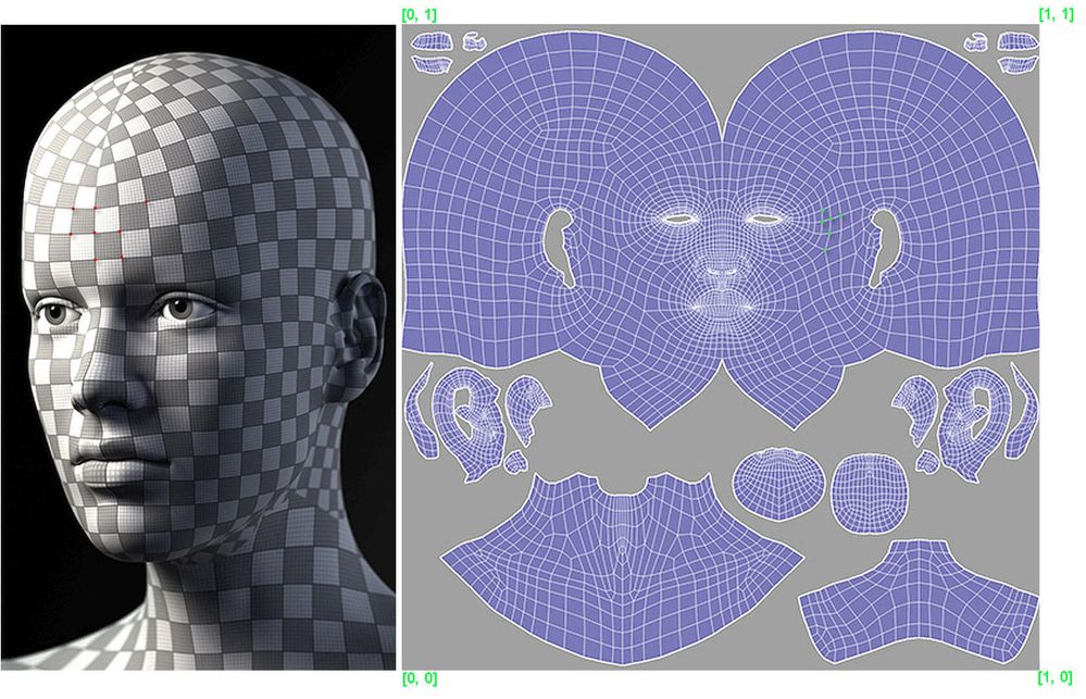 经纬坐标就是地球与地图之间从三维到二维的映射关系,通过经度和纬度两个坐标就可以定义地球表面上一个确切的地点,而对于三维场景中的模型来说,与二维贴图之间的映射关系叫做纹理坐标,也就是UV。如下图就是一个可视化的纹理坐标的结果。