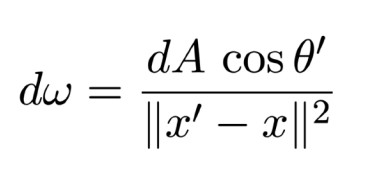 关系式中的 cosθ’ 是为了计算出光源上微分面积元正对半球的面积,之后再按照立体角的定义dω = dA / rr,除以着色点x与光源采样点 x’ 距离的平方即可。